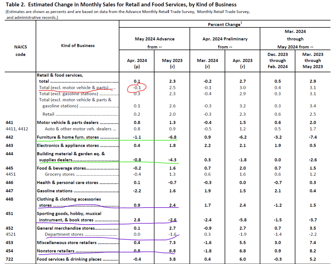 前天美国商务部公布的5月零售数据不如预期,环比总体(零售+餐饮服务)微增0.1%。如果扣除汽车消费,环比还下跌了0.1%。好消息是,如果不看餐饮服务,零售环比增长0.2%,同比上升2%。还有一个重要的参数:4月的数据修正后,环比微跌0.2%,这也意味着4月和5月连续两个月零售额在正负0.2%很小的区间波动,没有明显的大起大落。